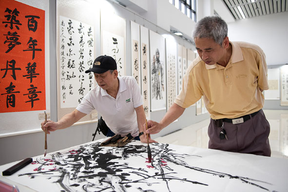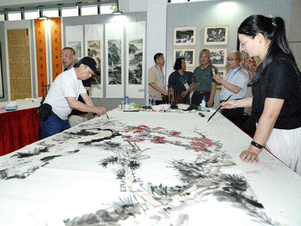 來自福州市人大書畫院的王兆乃,莆田市人大書畫院的朱雁嫻,寧德市人大書畫院的阮憲鎮(zhèn)、李凱,平潭人大書畫院的馮世明以及南平市人大書畫藝術(shù)院的周聯(lián)合現(xiàn)場共同創(chuàng)作了8尺畫作《英雄贊》。