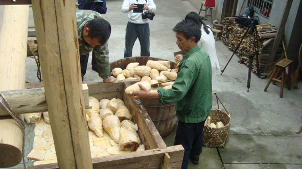老雷把筍裝進竹筐里,用扁擔挑下山去。家中做筍主要還有他妻子雷菊英和女兒雷求花,只見她們把整個的筍一個個豎排著放進柴灶大鍋里,下圓上尖,造形美觀。他說這樣燒比較均勻,更容易去澀味。在大鍋里沸水煮約二三個小時,他用一根長竹筷由筍底部穿出一個個筍,放進筍桶里。他說筍漂洗個一二個小時就可以,主要是熟筍去堿去色。吃新鮮筍,這樣就可以了,用來切片炒吃,或用肉煮吃。如做筍干,就要加工,最麻煩的是做“明筍”筍干。就是清明前后的筍做的筍干,筍選擇要求不高,當然越嫩越好。工序是先將煮好漂好的鮮筍一個個裝進筍榨箱里,一層擺齊擺好后再鋪一層,接著用板鋪在上面。再鋪,鋪滿箱后,上面鋪上板,加上木條,將筍杠上栓繩在木輪上加緊,在榨梯上調整高低,讓箱上壓力增大,壓榨得里面出水。他說,“榨”很重要,以后每天榨輪上的繩子都要加緊。主要是把筍內的水榨出,里面不會生蟲和變色。做“明筍”筍干的筍要榨一個月左右,然后才起筍。將已壓得扁平的筍取出,用水洗和刷子刷干凈,鋪在篩子曬干,約曬幾個太陽。或者用木炭爐火,上面加烤篩來烤干。一般100斤清明前的鮮筍可做6斤筍干,清明后鮮筍只能做5斤筍干,所以成本比較大。如做香菇筍干,就比較省事。最好是用清明前的頭批筍做,比較短小節少鮮嫩,將筍煮好漂好的筍用刀開邊破開,放進筍榨中榨一晚,取出洗一下,烤一晚,烤干就可。做其它階梯筍、茭筍、筍絲、筍片,就更簡單些,都是壓榨一下,曬干烤干,要吃時只要泡軟拿去炒就可。