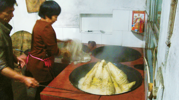 雷菊英說,每年清明前后用長出的春筍做筍,要忙一二個月。春筍還要看大年小年,大年產筍多,小年產筍少,還有花年,產筍不多也不少。一直到谷雨后還有小筍、苦筍、雷公筍、水竹筍、花殼筍等,是小莖竹長的,把嫩的拔采來,放在鍋里煮熟,撈出來就可以。冬天到毛竹山挖根部的冬筍,剝開切片炒吃,人稱“玉蘭片”,也是一筆好收入。