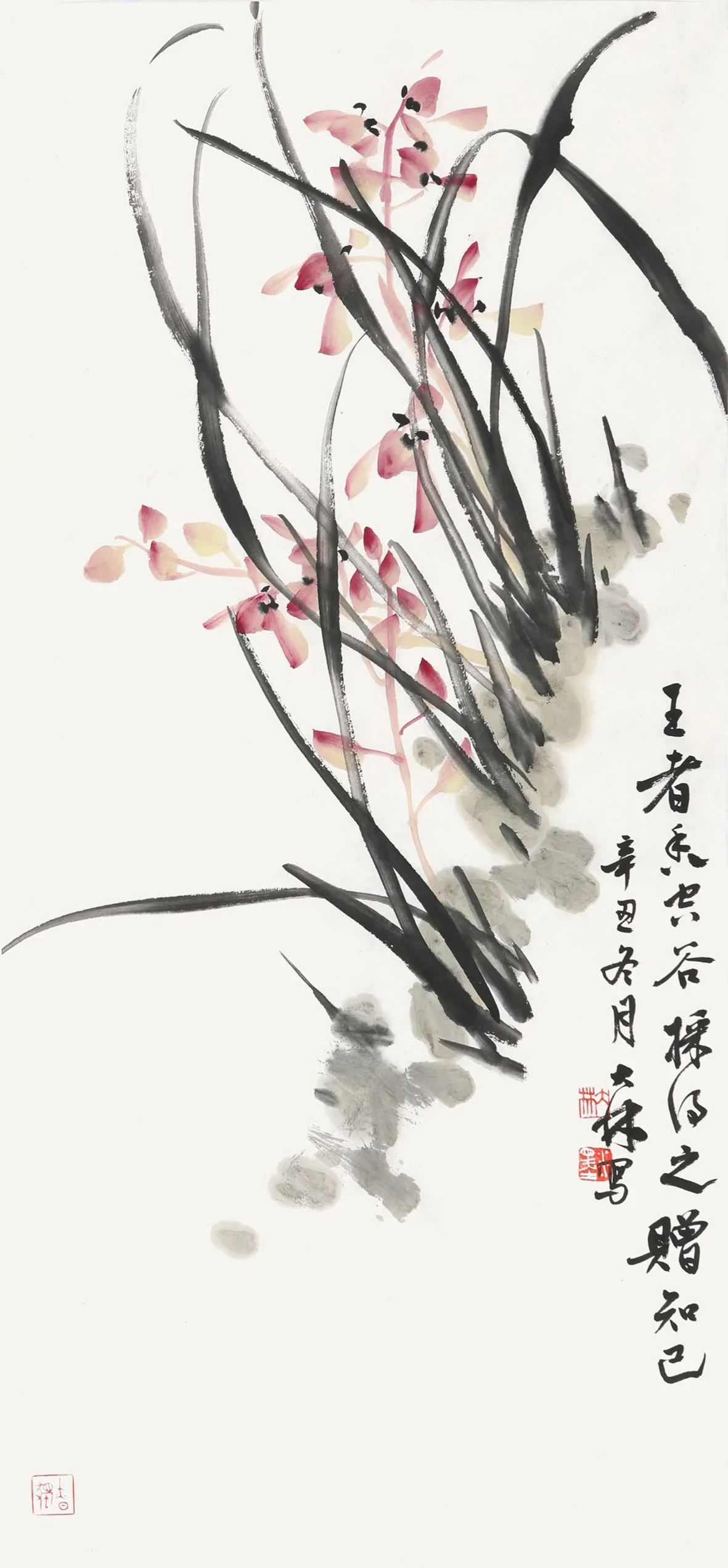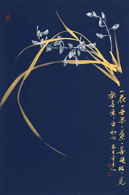 大林既是畫蘭高手,又是書法家。2019年,曾在朱紫坊舉辦過個展,今次又與為峰先生聯袂辦展。觀其寫蘭作品,在繼續追求墨韻的變化的基礎上,更注重用色彩來表現蘭花,雖有色彩但依然保持著素蘭的韻味。我注意到,大林寫蘭出筆更加果敢,蘭葉更加挺秀,蘭花更加多姿。大林的書法,隨意而率真,很好地表達了蘭的意味。觀大林的作品,不僅享受了他的寫蘭藝術,吮吸了滿紙蘭氣,也欣賞到了他的書法藝術。