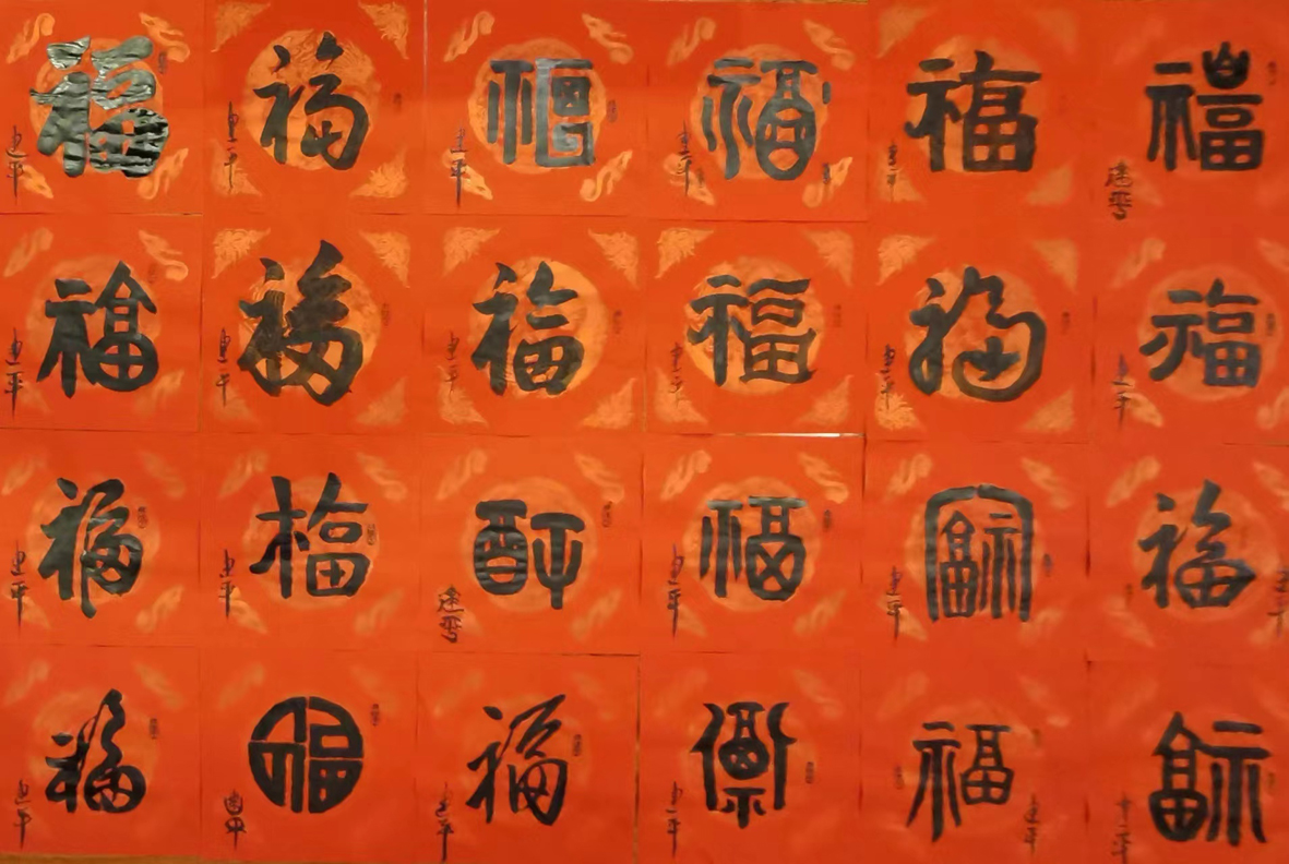 紅紅的紙張襯著烏黑油亮的不同“福”字,代表不同的寓意,表達一種“福”文化,傳遞美好祝福,祝福人們百福并臻,福氣多多……