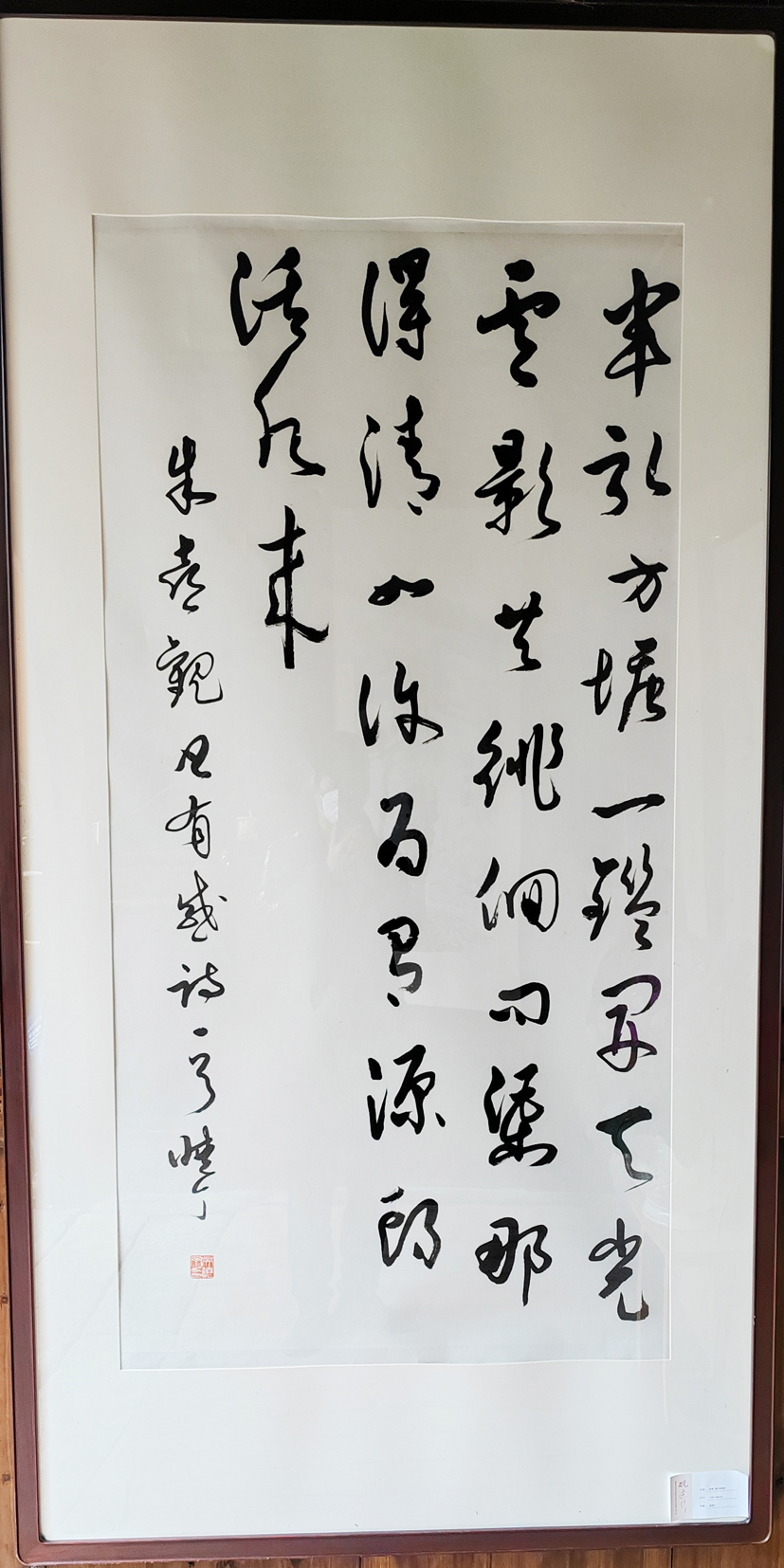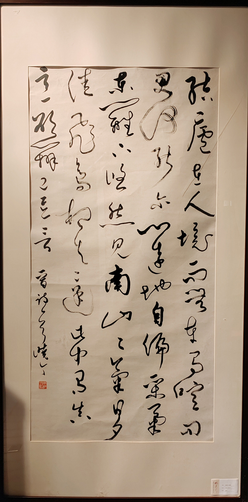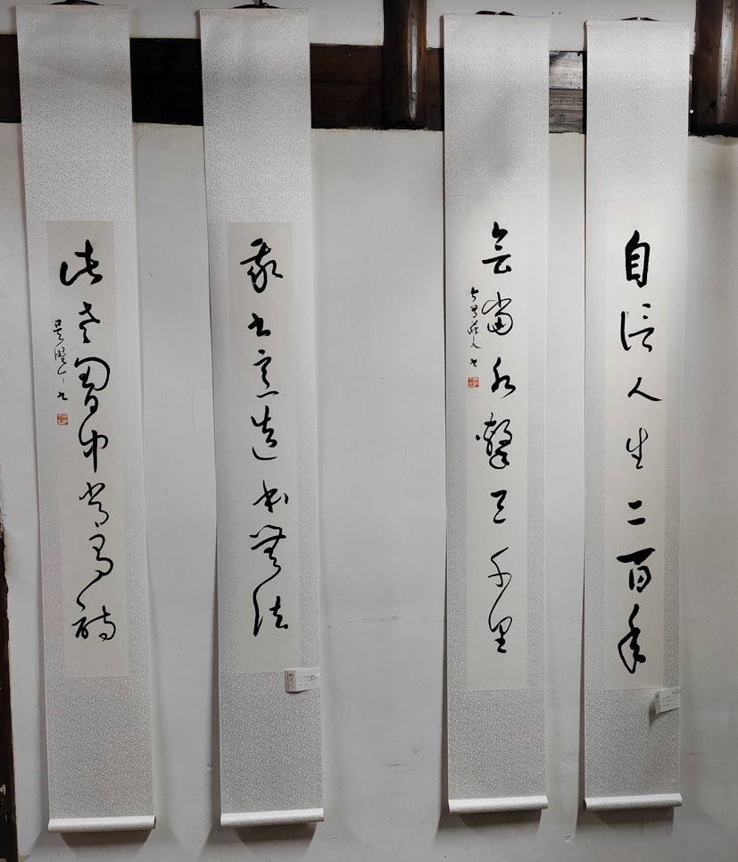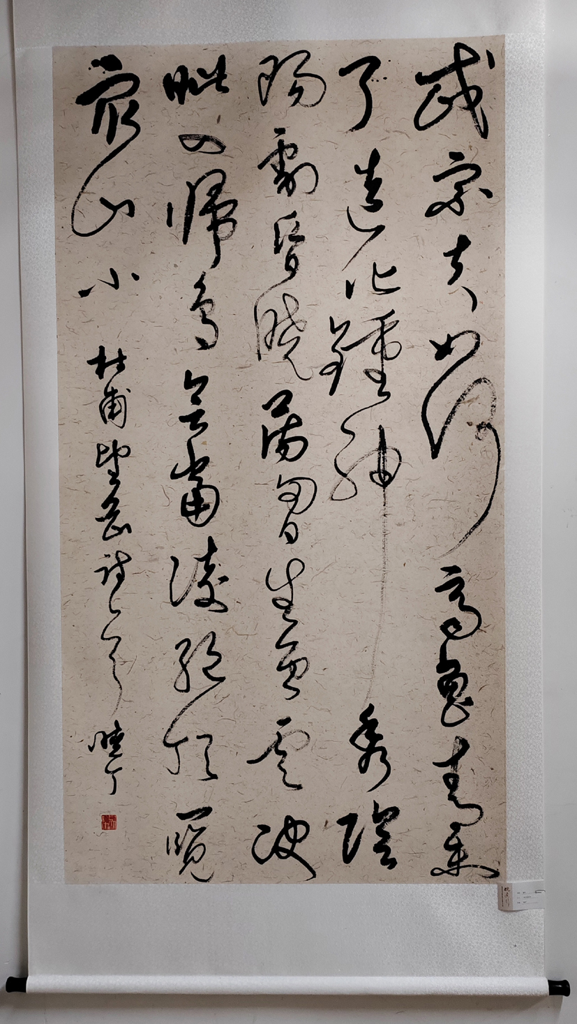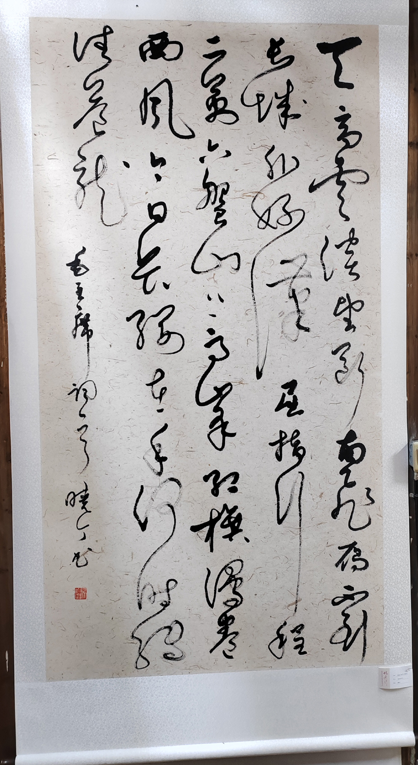 品鑒吳曉丁書法作品,給人以動感之美。動感是草書的重要特征,沒有動感就不叫草書。他的字或粗或細,或快或慢,忽大忽小,忽正忽側,有中鋒有側鋒,如一條飄揚之彩帶,隨風起舞,整幅作品呈現出龍飛鳳舞的效果,強烈地吸引觀者反復品味、聯想。草書最重流美,最忌滯呆。吳曉丁的書法作品大多一氣呵成,其筆勢連綿環繞,龍騰虎躍,氣脈貫通,狂逸酣暢,自由奔放,駕馭筆墨的能力可見一斑。