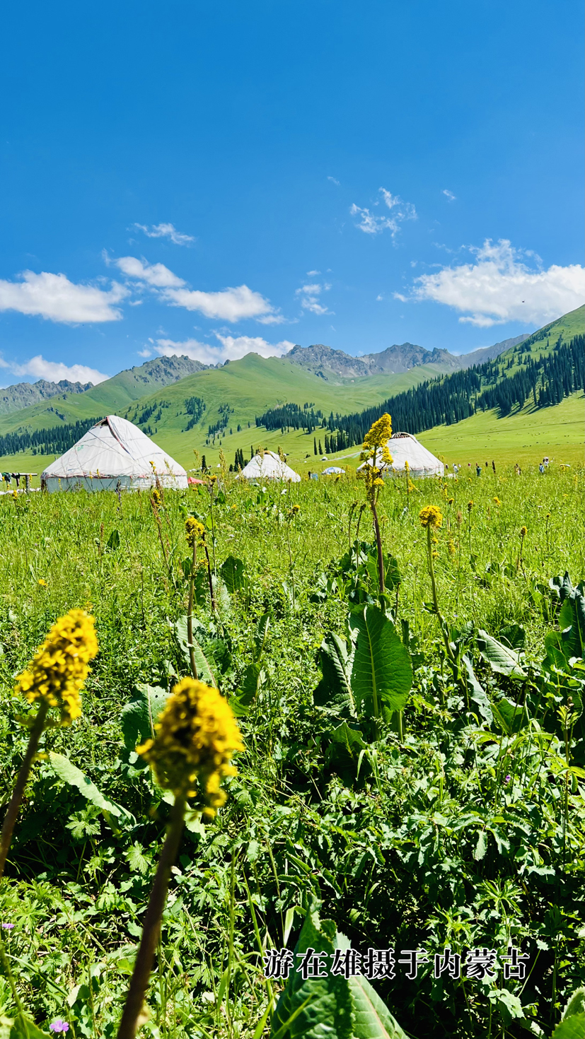 越野車門一開,撲面而來(lái)是翠綠深邃的寫意:沃野,洼地,丘陵與小山,盡是一望無(wú)垠的綠海,投身其中就仿佛投入母親的懷袍,氈房點(diǎn)點(diǎn)的蒙古包上,五彩旗在迎風(fēng)搖曳,我知道,那是母親在揮舞著歡迎的雙手,你來(lái)啦,她便無(wú)憂!遙望天空,是原始的湛藍(lán)、清澈,白云朵朵不時(shí)在不遠(yuǎn)山頂?shù)牟菁馍匣瑁虺蓤F(tuán)、或成陣、或單飛,有時(shí)就像吳剛與嫦娥在舞袖翩躚、在動(dòng)情表白,生動(dòng)、率真、熱情,讓人無(wú)法抗拒,我知道,這種詩(shī)意,是上蒼垂青,專為草原打造的一種悠揚(yáng);抬頭遠(yuǎn)眺,靈性的牛羊,一群群,一簇簇,或站,或臥,或嬉戲,或低頭吃草,偶爾可見的牧人,騎著摩托在放歌,聲音嘹亮高亢,又透著悲哀與滄涼,我知道,那是草原人對(duì)生命的思考和追問,對(duì)草原由衷的敬畏與感恩,赤子般的情懷,幾天來(lái)司機(jī)兼導(dǎo)游的幾位蒙族兄弟就是最好例證,唱歌喝酒,粗獷而豪邁,卻十分愛惜草原上的每一朵花,每一片草,遇游人摘花,總會(huì)上前勸服,言語(yǔ)委婉而堅(jiān)定,遇路窄交會(huì)車,從不肯碾壓草地而過,總是主動(dòng)把車倒退很遠(yuǎn),直到寬處。是呀,草原是草原人的,也是我們的!于是,草原上獨(dú)自漫步的我,也變得是手足無(wú)措,舒緩的步態(tài)逐漸持重起來(lái),生怕一失足而糟蹋那些美麗的生靈!
