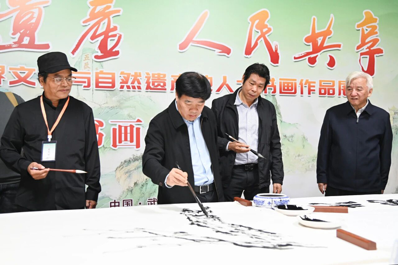 陸開錦在致辭中說,此次展覽以書畫為媒,聯結了全國四大“世界遺產地”,既是一次跨越地域的文化對話,更是一場踐行習近平總書記重要囑托、提升文化影響力的生動實踐。我們將從深化協同合作的深度、加大文化交流的力度、厚植精神內涵的厚度、拓展平臺前景的廣度等四個維度發力,推動此類活動走深走實、見行見效,讓書畫藝術成為連接更多遺產地、傳播中華文化、助力文化強省建設的重要橋梁,讓世界遺產的文化影響力持續釋放、代代相傳。