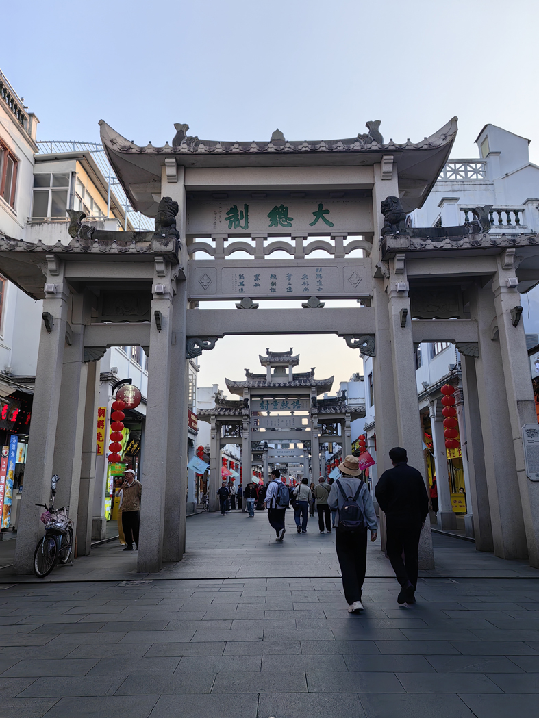 走不遠,我們來到牌坊街。這里是潮州的文脈根基,也是古城最鮮活的市井縮影。我們沿著這條兩公里長的古街緩步前行,一路觀賞矗立的二十余座明清石牌坊,匾額上的鎏金大字,雖褪去了往日的流光,卻依舊字字清晰,每一座牌坊,都鐫刻著一段光耀門楣的故事。我掏出手機不停拍照記錄,定格下“大總制”“盛世元凱”“宗伯學士”等石牌樓的古韻,也收錄了街巷間濃郁的煙火氣息。同行的當地朋友陳德平告訴我:“這些牌坊,是潮州人崇文重教的見證,也是老祖宗留給我們的瑰寶。”一條街匯聚的牌坊數量之多、種類之全,在國內實屬罕見。