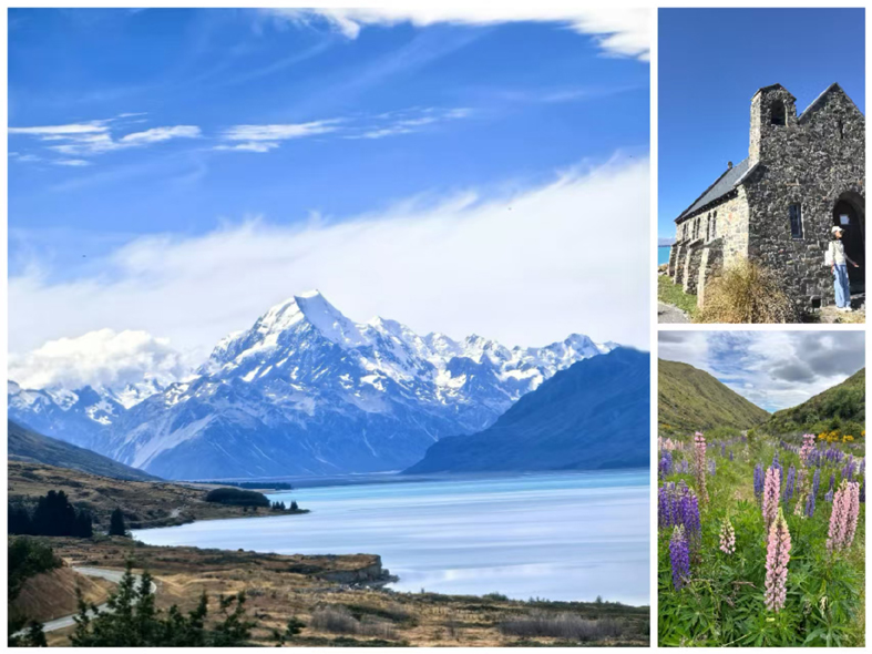 南島行的最后一天,車子沿著蒂卡波湖緩緩前行,離別的情緒輕輕漫上心頭。車窗外那片獨有的奶藍色湖水,安靜得不像話,卻在第一眼就撞進心底。岸邊的魯冰花早已過了盛放時節,只剩幾縷淡淡的色彩,散落在微黃的草坡上。風掠過耳畔,那首熟悉的旋律忽然輕輕響起:“夜夜想起媽媽的話,閃閃淚光魯冰花……”一瞬間,異鄉的風也變得柔軟,連呼吸都裹著一絲想家的溫柔。