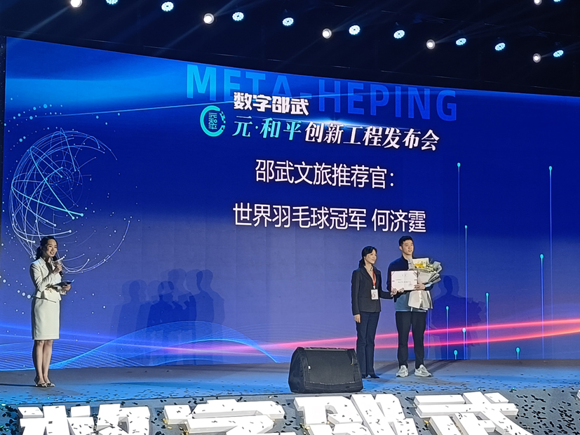 邵武市人民政府市長郭緋紅向邵武籍世界羽毛球冠軍何濟霆頒發榮譽證書,邀請他擔任邵武文旅推薦官。