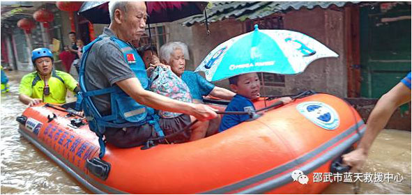 這組對話來自于通泰街道北城門。由于受上游光澤強降雨天氣影響,富屯溪水位上漲異常迅猛,倒灌進低洼大街小巷,北門積水最高處接近2米多深。面對暴雨洪水,藍天救援中心接到應急局發來的求援信號,立即組織隊員,發揮災害事故救援專業特長,出動志愿者23人,沖鋒艇3艘,向災區出征,戰斗在抗洪搶險第一線,先后到北城門、金山碧水、水北四板路居民區等地,來回折返運輸災區群眾。汗水與雨水交織在一起,模糊了他們的視線,他們不叫苦,不叫累,只聽到那句“一二,加油”響徹天際。