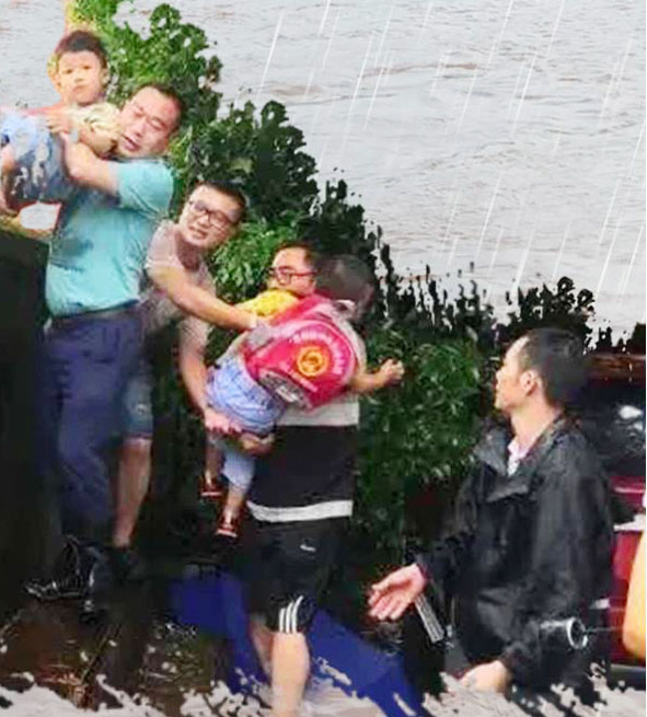 而在北城門的另一頭,邵武市委常委、組織部部長嚴軍等領導在巡查中發現金娃娃幼兒園暑期班61名幼兒被洪水圍困,迅速組織城管局、住建局等部門隊伍前來救援,以接力的方式,組成“人梯”,將孩子從幼兒園外墻一個一個轉移出來,受到了家長的一片稱贊。