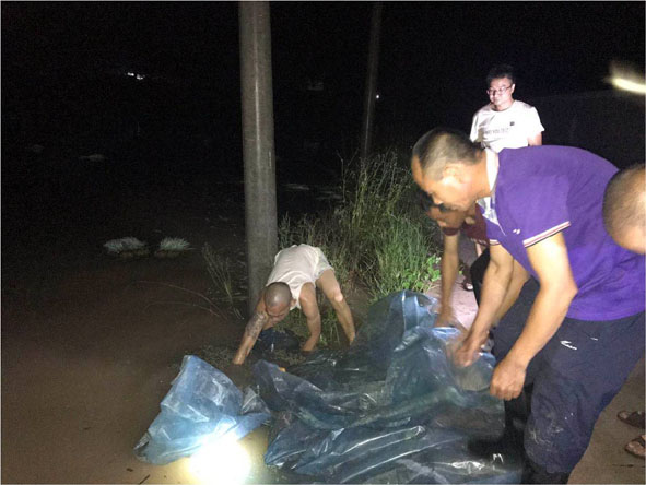 福建華至生態農業公司黨員用木板及沙石堵住進水口。