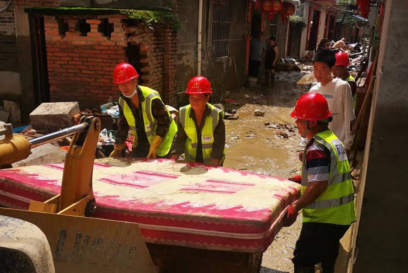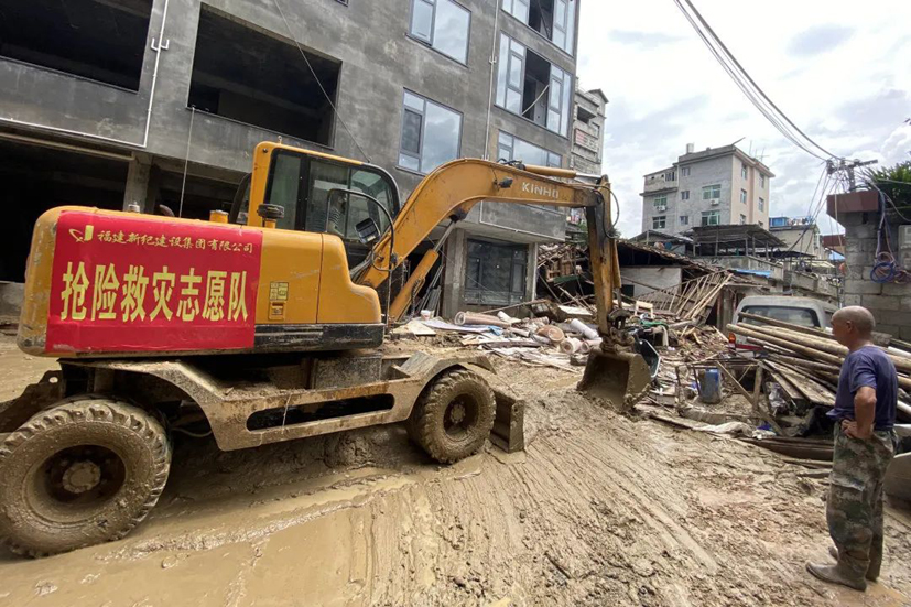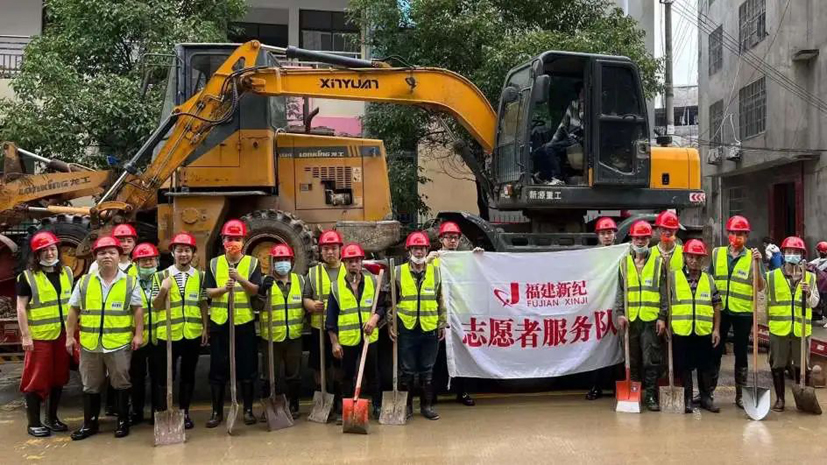 當得知松溪縣河東鄉災情尤為嚴重,搶險救援和災后重建工作任務艱巨,極缺專業救援隊伍時,身為人大代表、公司黨委書記的邱為海主動請纓,充分發揮黨組織的引領作用,迅速成立了以黨員和專業骨干組成的“福建新紀建設志愿服務隊”,30多名志愿者自備糧草自理食宿,攜帶7部運輸車、4部鉤機、2部鏟車及3輛平板車等救援裝備,從建陽遠赴百里,緊急馳援河東鄉,投身抗洪搶險“主戰場”。